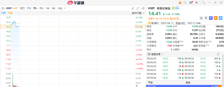 美股黃金股集體飆升,哈莫尼黃金漲逾11%,金羅斯黃金漲逾6%,巴里克黃金漲逾5%,伊格爾礦業、紐曼礦業漲約4%。