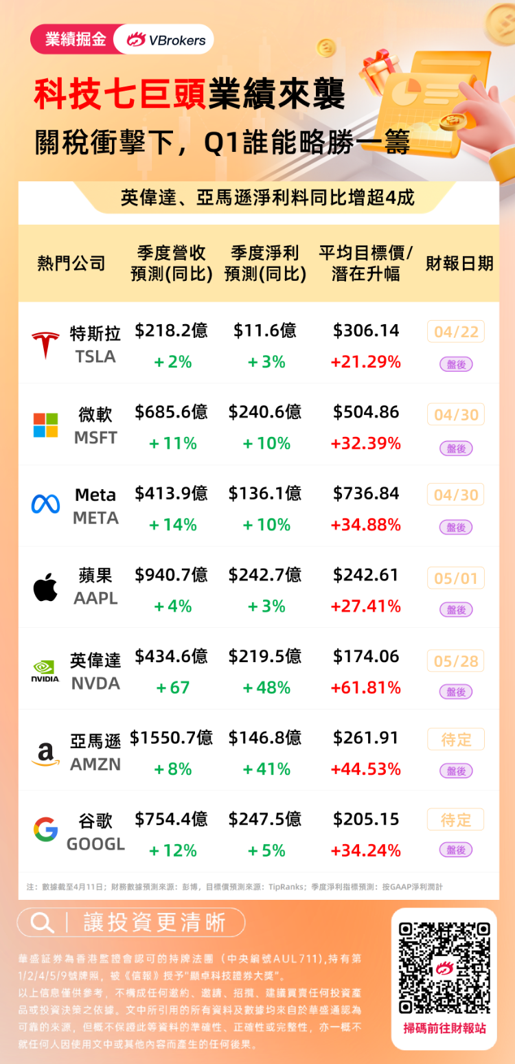 根據彭博分析師預期,華盛資訊整理了美股科技“七巨頭”的業績預測一圖,詳情如下: