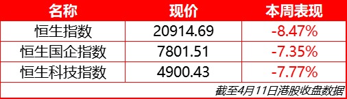 港股行情本週受關稅事件衝擊,整體先抑後揚。恒生指數週一因關稅恐慌情緒,單日暴跌13.22%失守兩萬點關口後,週二、週三進入震盪修復階段,週四週五迎來反彈。截至收盤,恒生指數跌8.47%,報收20914.69點;科技指數跌7.77%,報收4900.43點;國企指數跌7.35%,報收7801.51點。