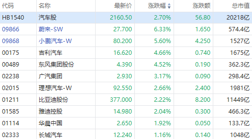華盛資訊4月14日訊,汽車股普漲,蔚來漲超6%,小鵬汽車漲超5%,吉利汽車、東風集團漲超4%,廣汽漲超3%,理想汽車、比亞迪股份漲超2%,長城汽車漲超1%。