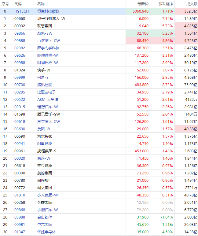 科網股集體走高,百度集團-SW大漲近5%,嗶哩嗶哩-W、快手-W漲超3%,網易-S、阿里巴巴-W、騰訊控股漲超2%,美團漲超1%。