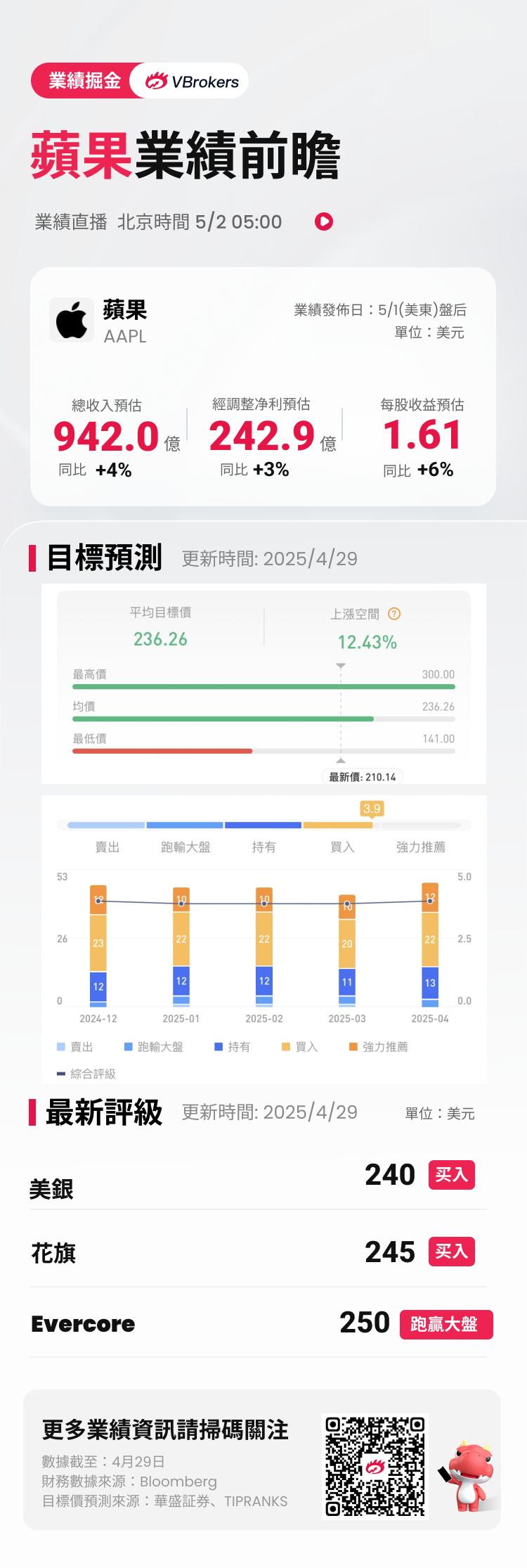 美銀證券發佈研報稱,料蘋果公司將公佈收入超出預期的業績表現,主要由於關稅擔憂導致的需求提前。該行略微上調對蘋果3月及6月季度的收入預測,同時下調更遠期的收入預測,以反映更復雜供應鏈導致的較高成本,以及人工智慧啓用Siri推出的延遲。美銀證券將蘋果2025及2026財年收入預測由4110億及4500億美元,分別調整至4120億及4400億美元;每股盈利預測由7.3及8.2美元,調整至7.25及7.82美元。同時將該股目標價由250美元下調至240美元,維持“買入”評級。