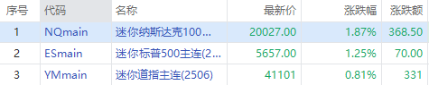 美股三大股指期貨週四盤前走強,標普500主連 $ESmain 漲1.25%,道指主連 $YMmain 漲0.81%,納指主連 $NQmain 漲1.87%。