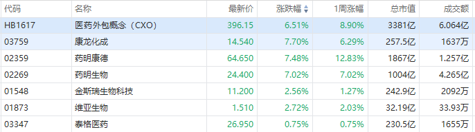 華盛資訊5月2日,港股醫藥外包概念午後繼續拉昇,藥明康德、康龍化成、藥明生物漲逾7%,凱萊英漲逾4%,金斯瑞生物科技漲逾2%。