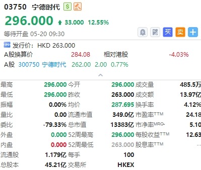 華盛資訊05月20日訊,港股寧德時代今日掛牌,截至發稿大漲逾12%,報296港元/股,中籤一手賬面浮盈3300港元,最新總市值超13383億港元。