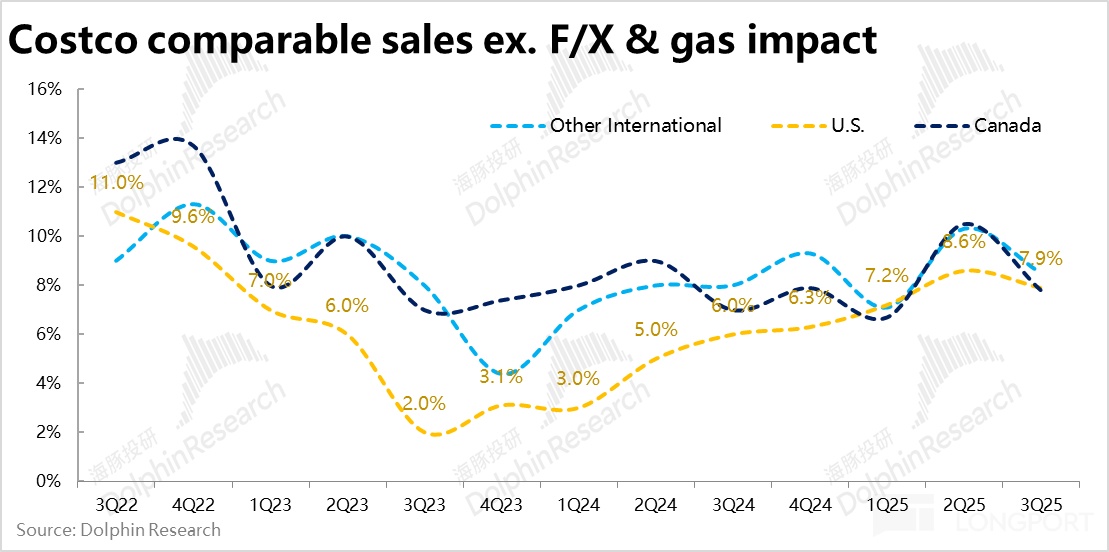 2、海外地區增長也不差:分地區看,美國/加拿大/其他國際地區的同店銷售分別增長了 6.6%/2.9%/3.2%。乍看之下,加拿大和其他國際地區的名義增速明顯跑輸美國本土,僅剩低個位數% 增長,看似非常疲軟。