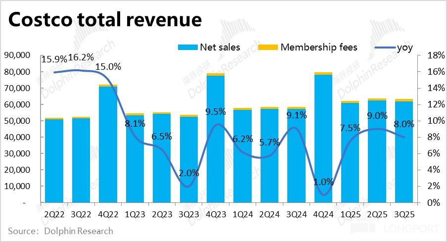 1、財務指標上,本季 Costco 實現總收入$632 億,同比增長 8%,表現平穩。由於公司按月披露銷售數據,因此市場對營收有充分預期,不會有明顯預期差。