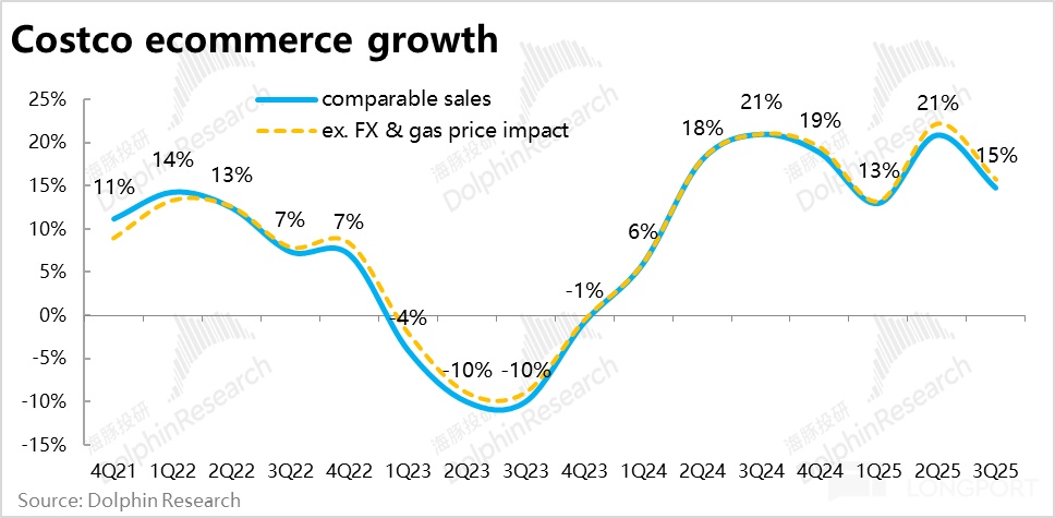 1、同店增長依然穩健:Costco 本季度整體同店名義銷售增速爲 5.7%,相比上季度顯著放緩了 1.1pct。但實際主要是受油價和匯率影響的拖累,剔除這些因素後同店增速仍達 7.9%,表現並不差。