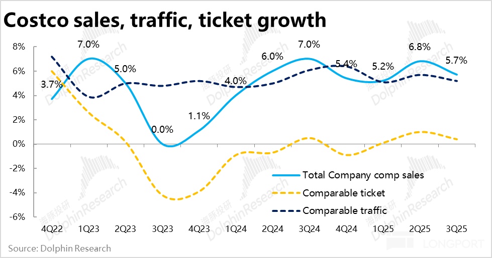 核心經營指標, Costco 本季度整體同店銷售增速爲 5.7%,相比上季度顯著放緩了 1.1pct。看似增長在通脹和關稅影響下明顯放緩,但實際剔除油價和匯率的影響拖累,整體同店增速依舊達 7.9%,環比僅略微降速 0.7pct,表現並不差。實際表現達標市場預期。