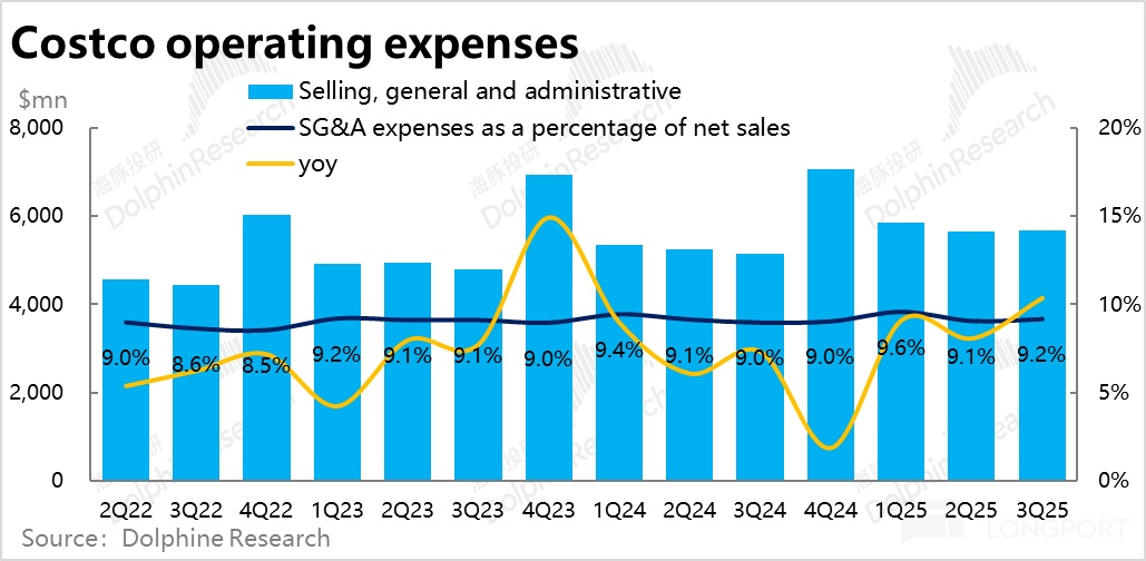 3、費用層面,Costco 本季銷售&管理合計支出 56.8 億,稍高於市場預期的 55.8 億。費用佔收入比重爲 9.16% 同比上升了 20bps。可見費用是呈擴張趨勢的。結合公司披露,主要是門店運營費用率同比擴大了 13bps,可見在關稅影響下,人力等相關費用成本確實有上升趨勢。