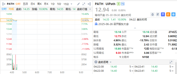 UiPath漲超10%,Q1業績超預期並上調全年指引。