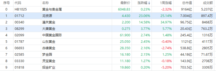華盛資訊6月2日訊,港股市場黃金股逆勢上漲,龍資源大漲23%,潼關黃金漲超14%,赤峯黃金、山東黃金漲超2%,靈寶黃金、招金礦業跟漲。