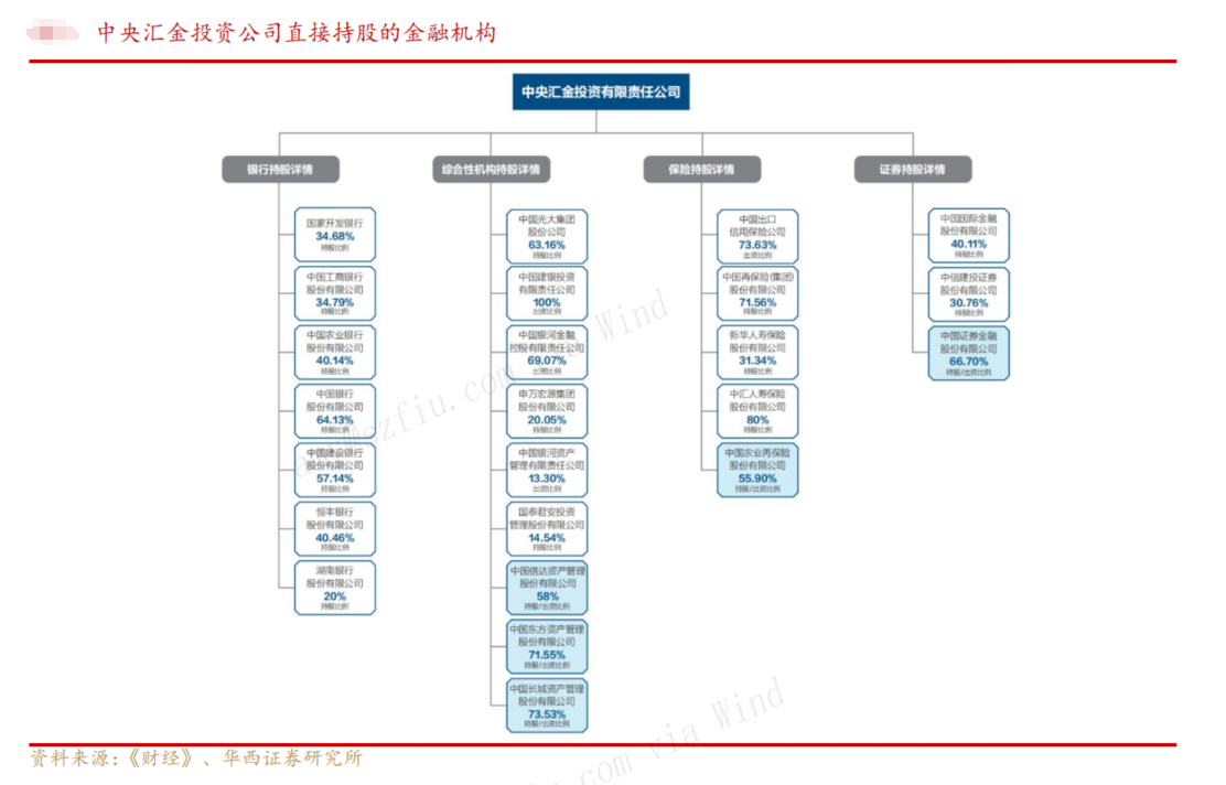 根據華西證券研報數據,自今年2月財政部完成5家金融機構股權劃轉後,中央匯金直接持股的金融機構已達24家,構建起覆蓋銀行、證券、保險、資產管理的全牌照矩陣。在證券領域,此次劃轉使中央匯金控參股券商數量從4家激增至8家,形成“七控一參”格局。除中信建投由北京金控控股外,銀河證券、中金公司等7家券商均以中央匯金爲實際控制人。