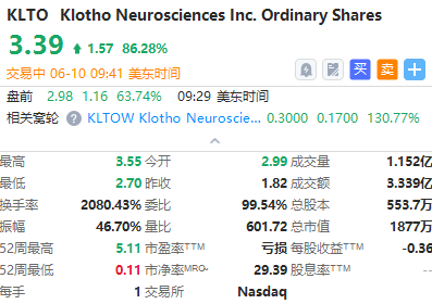 Klotho Neurosciences( $KLTO )繼昨日暴漲787.8%後,今日股價繼續飆升,暫報3.39美元,漲86%。消息面上,公司宣佈的臨牀前研究結果表明,提高Klotho基因表達有可能同時減緩多個器官隨年齡退化進程,從而延長壽命。