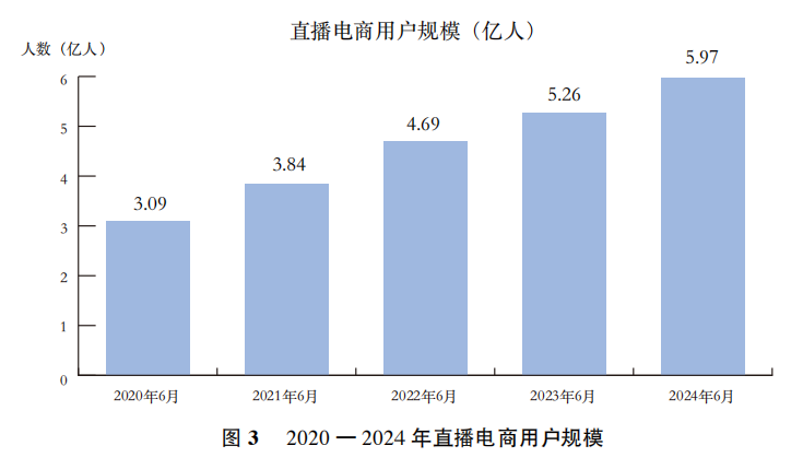 隨着行業規模的擴張,用戶基數也呈現爆發式增長。根據中國國際電子商務中心研究院引述《中國互聯網絡發展狀況統計報告》顯示,截至2024年6月,電商直播用戶規模爲5.97億人,佔網民整體的54.7%。直播電商用戶已成爲消費增長的核心驅動力。