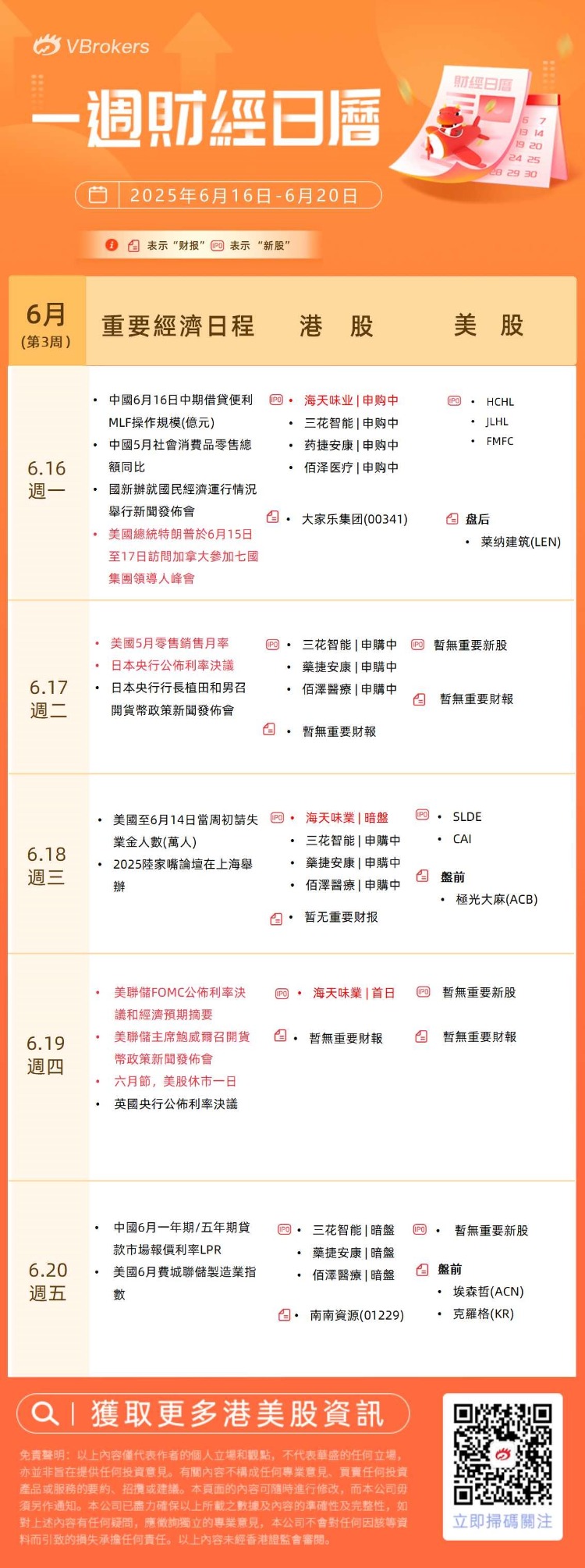展望下週,多家央行公佈利率決議,其中美聯儲將公佈利率決議,隨後鮑威爾發表講話,投資者密切關注降息的內容;此外,2025陸家嘴論壇6月18日舉行,或公佈重大金融政策。財報方面,關注萊納建築、埃森哲、克羅格;IPO方面,超200億市值“醬油茅”海天味業將於下週上市。安井食品、週六福、曹操出行等8只新股已通過聆訊,預計近期將啓動招股。