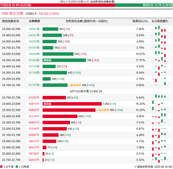 過去5日,恒指牛證合計約2470萬港元資金淨流入;恒指熊證則合計約4514萬港元資金淨流入。街貨分佈方面,至上週五,恒指牛證街貨佔比升至約65.8%,分佈在收回價23400點至23800點之間,累計相當約3070張期指合約;恒指熊證街貨在收回價24100點至24600點之間,累計相當約2618張期指合約。
