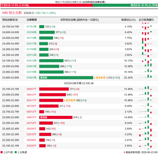 過去5日,恒指牛證合計約7480萬港元資金淨流入;恒指熊證則合計約8398萬港元資金淨流出套現。街貨分佈方面,至上週五,恒指牛證街貨佔比約57.8%,分佈在收回價22600點至23200點之間,累計相當約3351張期指合約;恒指熊證街貨在收回價23800點至24200點之間,累計相當約2988張期指合約。