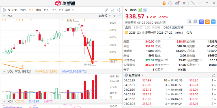 華盛證券數據顯示,美股“支付三巨頭”股價近期集體放量大跌,萬事達回調10%,Visa大跌近9%,Paypal跌近5%。