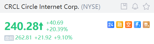 本週一(6月23日)美股盤前時段,穩定幣第一股 Circle Internet Corp. 續漲超9%,截至發稿報262.81美元,上市以來已累漲超700%: