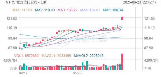 本週一(6月23日)美股盤初, 北方信託公司 一度漲超10%創近3年新高,截至發稿報121.8美元,漲幅8.9%: