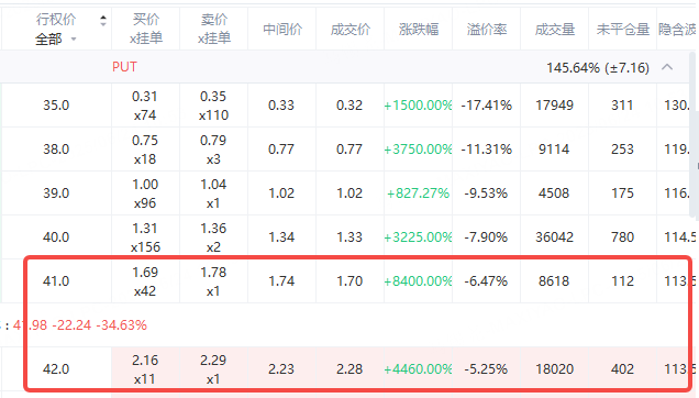 此外,多張於6月27日到期行權價41美元的看跌期權大漲,漲幅最高超8400%!