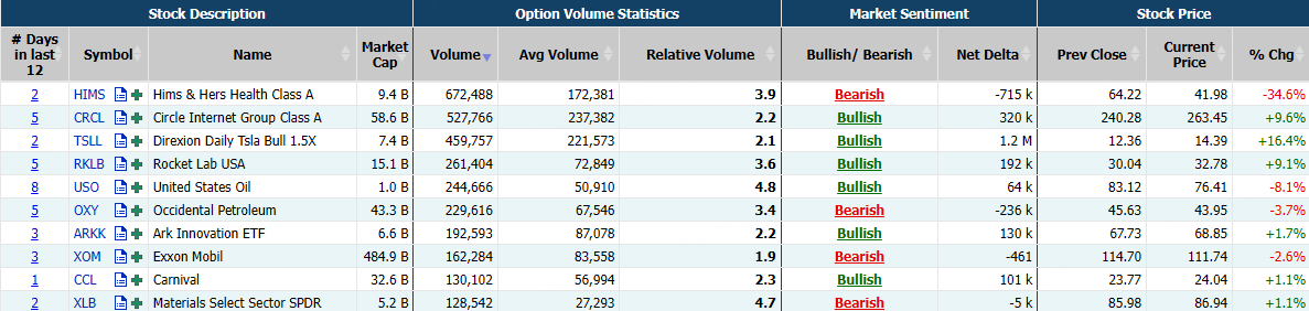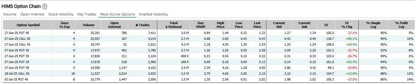 HIMS股價暴跌34%,期權合約成交較90日平均暴漲4倍達672,488張。其中6月27日到期的40美元看跌期權交易量較高,共有35,201份合約交易。
