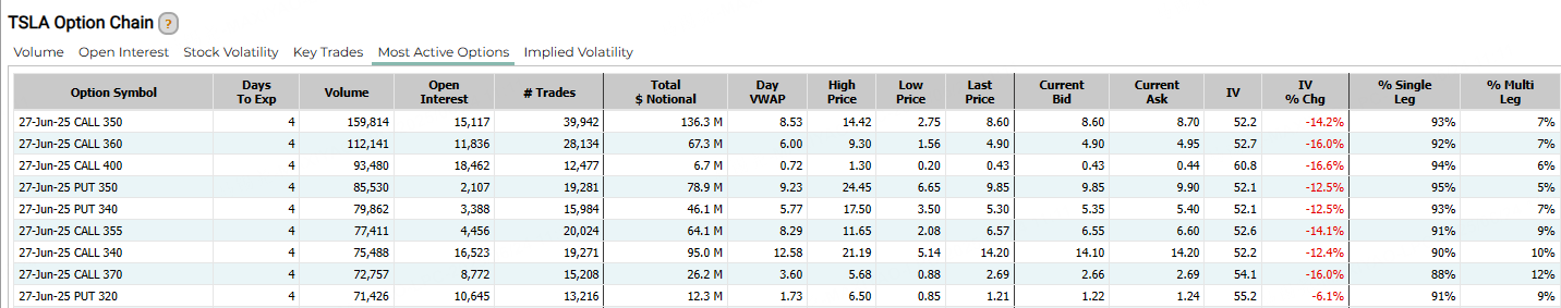 昨日,特斯拉大漲8.23%,期權合約成交350.52萬張。6月27日到期的350美元看漲期權交易量較高,共有159,814份合約交易。