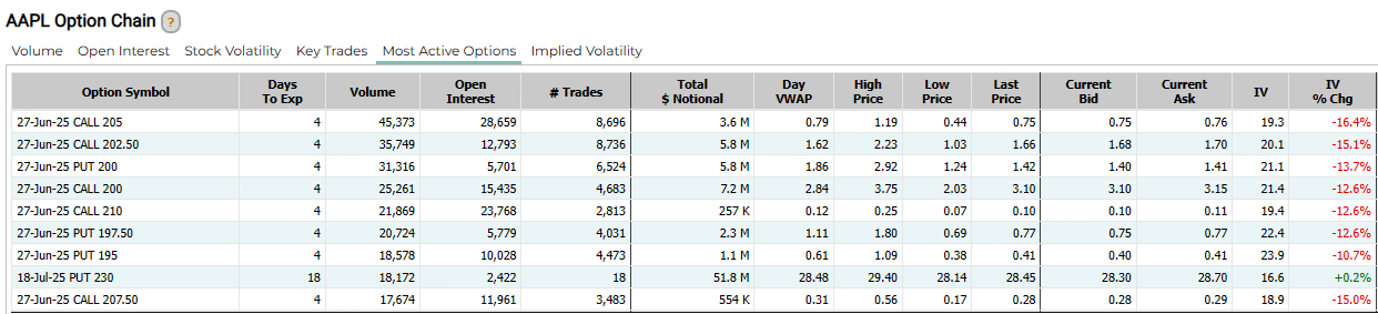 昨日,蘋果微漲0.25%,期權合約成交72.72萬張。其中6月27日到期的205美元看漲期權交易量較高,共有45,373份合約交易。