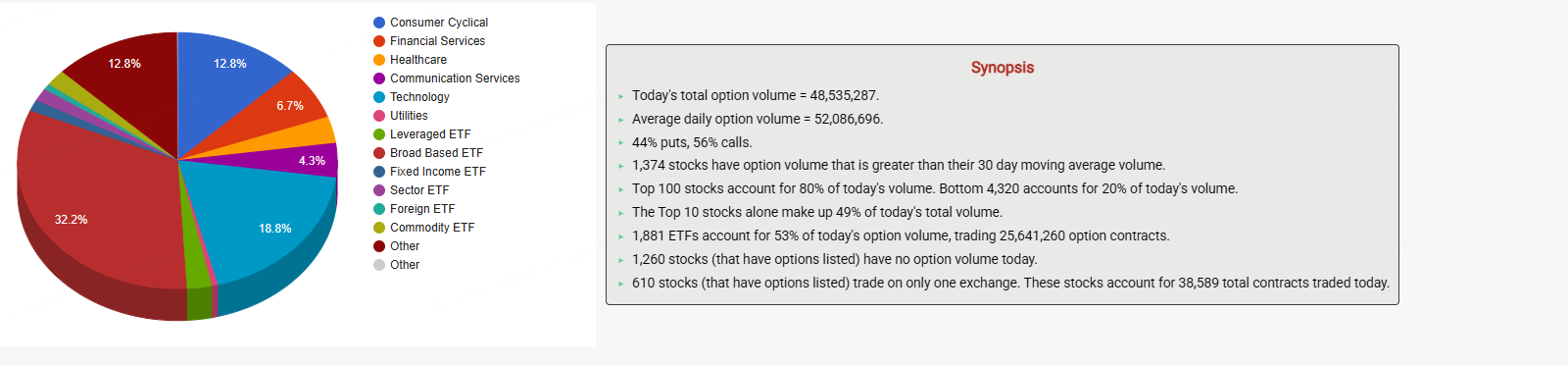 期權市場總成交量48,535,287張合約,成交量較昨日大幅下滑,低於90日平均,其中看漲期權佔比56%。