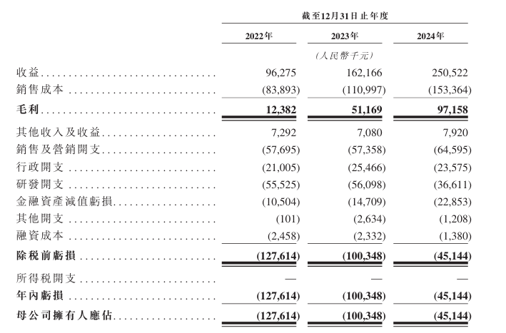 2022-2024年,公司分別錄得收益9627.5萬元(人民幣,下同)、1.62億元及2.51億元。同期對應年內虧損1.28億、1億及4514.4萬元。