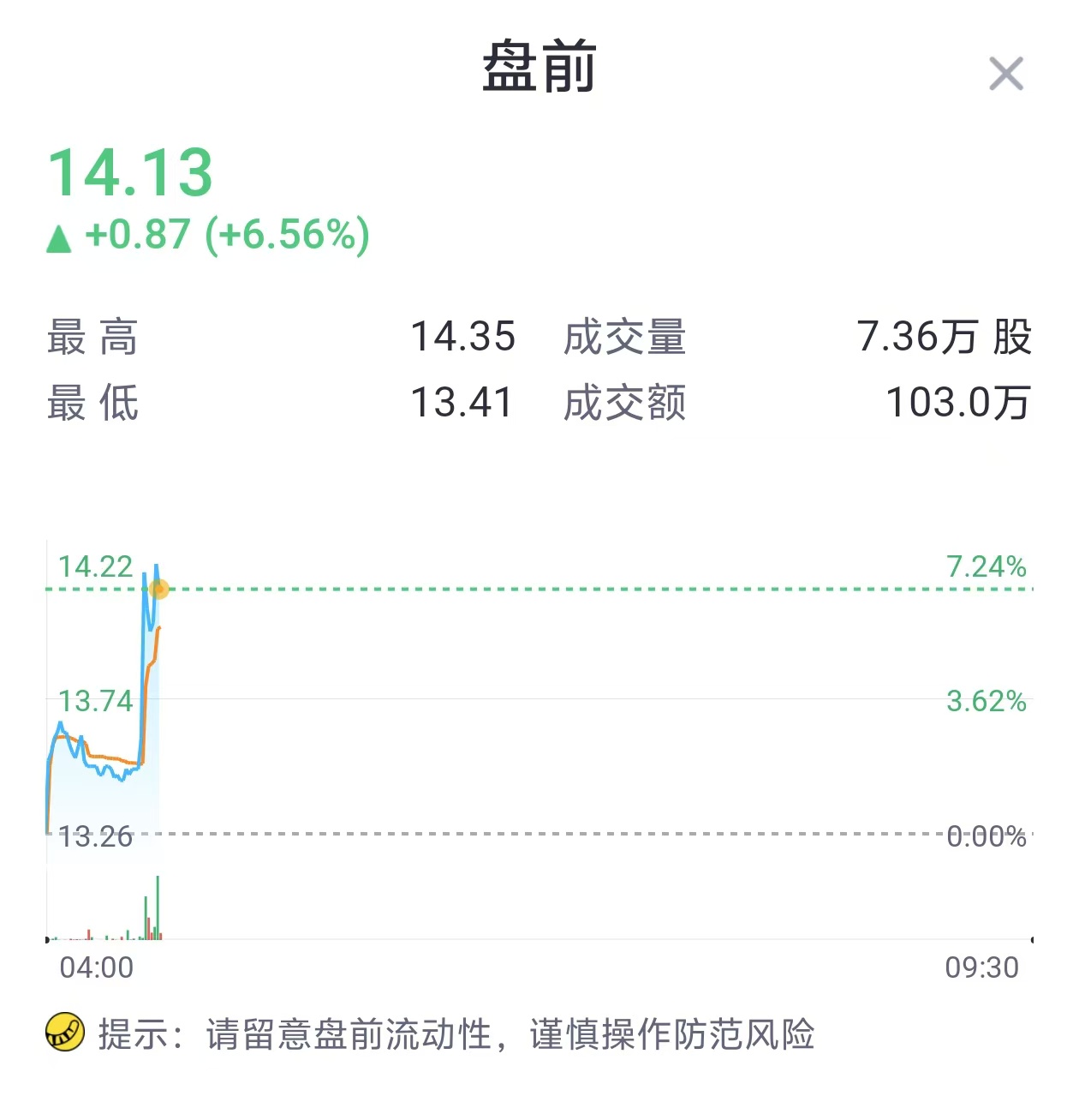 本週三(6月25日)美股盤前時段, 小馬智行 漲超6%,截至發稿報14.13美元:
