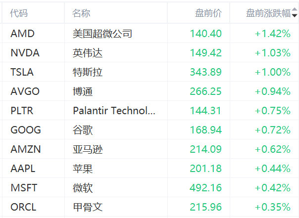 美股盤前時段,明星科技股普漲,截至發稿 美國超微公司 、 英偉達 、 特斯拉 均漲超1%:
