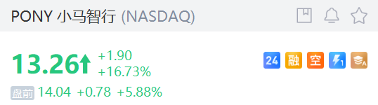 獲納入納斯達克中國金龍指數, 小馬智行 盤前一度漲超11%,截至發稿報14.04美元: