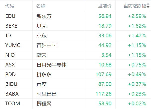 熱門中概股盤前多數走高,截至發稿 新東方 漲超2%, 貝殼 、 京東 、 百勝中國 、 蔚來 均漲超1%: