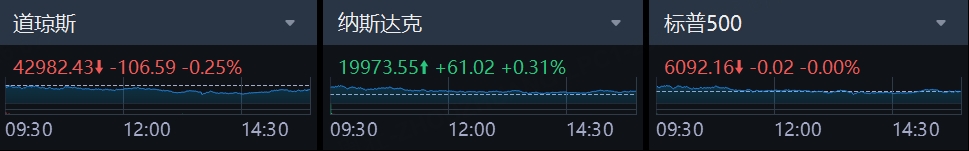 美東時間週三,美股三大指數漲跌不一,截至收盤,道指跌106.59點,跌幅爲0.25%,報42982.43點;納指漲61.02點,漲幅爲0.31%,報19973.55點;標普500指數跌0.02點,報6092.16點。
