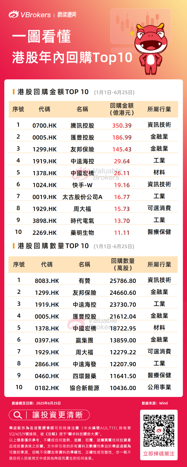 具體來看,截至2025年6月25日,港股年內回購金額約924.11億港元。其中,港股“回購王”騰訊控股年內回購約350.39億港元,滙豐控股共計回購186.99億港元超越友邦保險,晉升爲港股年內回購TOP2。此外,友邦保險、中遠海控、中國宏橋年內分別回購145.43億港元、29.64億港元、26.12億港元。
