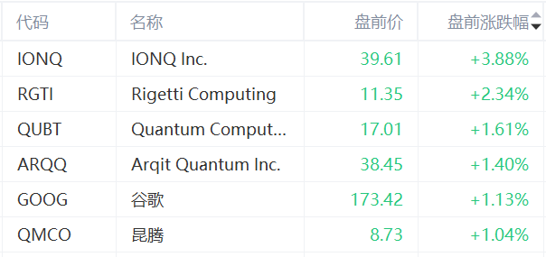 量子計算概念盤前走高,截至發稿 IONQ Inc. 漲近4%, Rigetti Computing 漲超2%, Quantum Computing Inc. 、 昆騰 漲超1%: