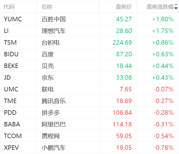 熱門中概股盤前漲跌不一,截至發稿 百勝中國 、 理想汽車 漲近2%, 小鵬汽車 跌超1%: