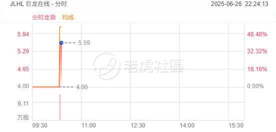 本週四(6月26日),智能項目工程解決方案提供商 巨龍在線 漲近40%觸及熔斷,截至發稿報5.59美元: