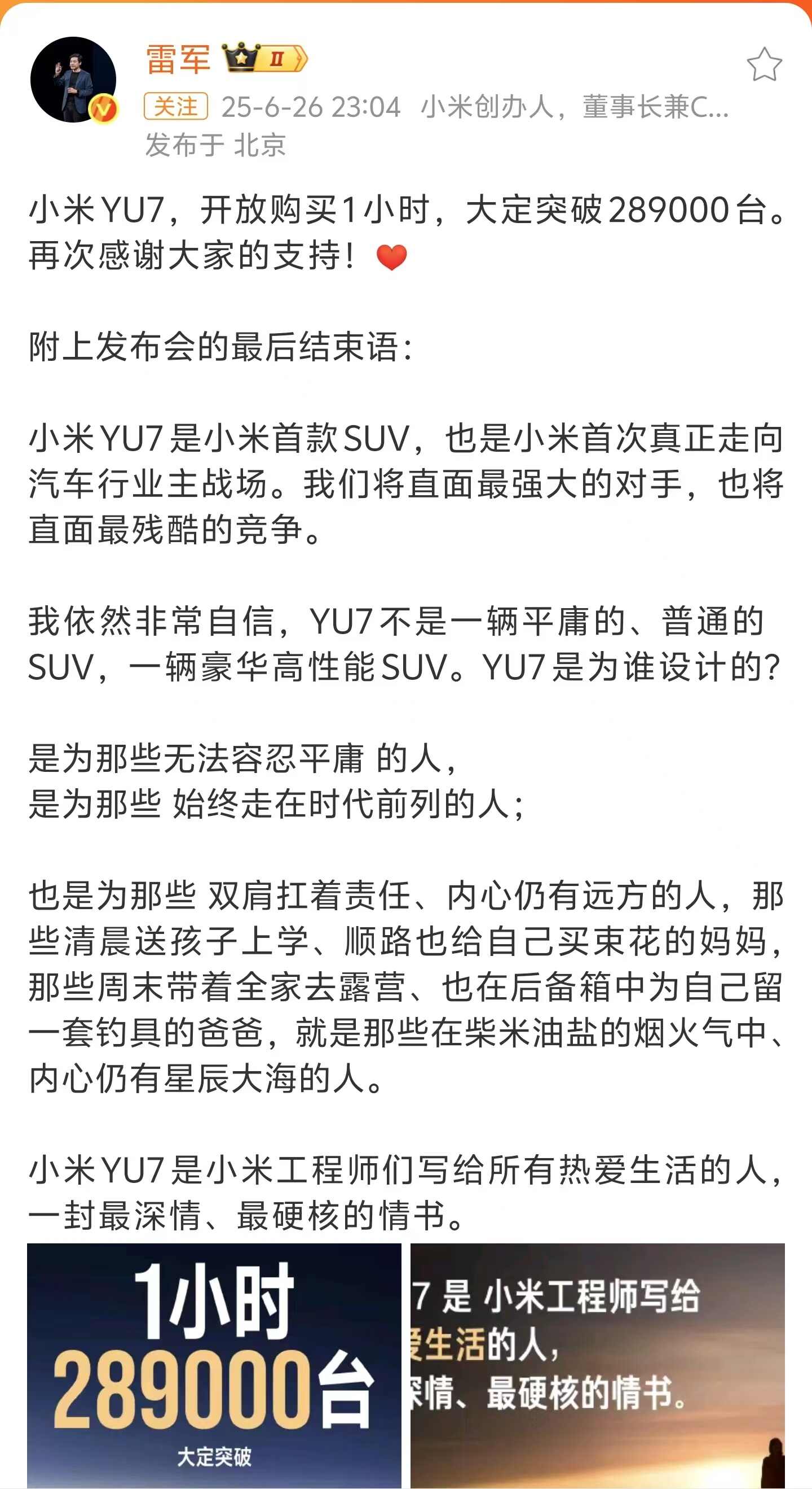 金吾財訊 | 2025 年6月26日,小米集團召開人車家全生態發佈會,旗下新車小米YU7甫一亮相便引爆市場,3分鐘大定破20萬臺,刷新新能源汽車市場瞬時訂單紀錄,帶動小米集團美股 ADR 盤中漲幅一度超10%。根據雷軍微博最新動態顯示,YU7在開啓預定後1小時內大定突破28.9萬臺。
