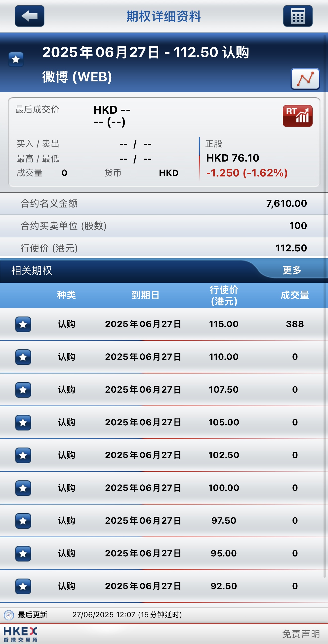 微博早盤下跌1.62%,期權方面:其到期行權價115港元認購期權暴漲9500%,今日到期行權價115港元的認購期權成交量居前,成交388張合約。