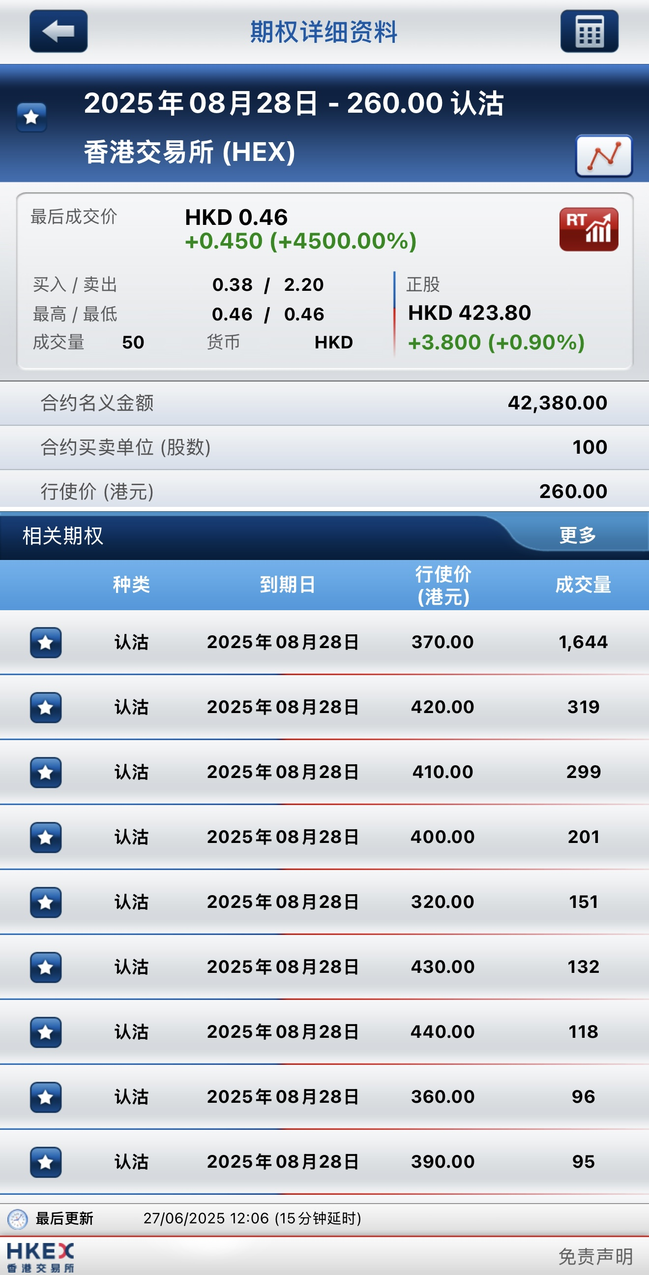 香港交易所早盤上漲0.9%,期權方面:其到期行權價260港元的認沽期權暴漲4500%,8月28日到期行權價370港元的認沽期權成交量居前,成交1644張合約。