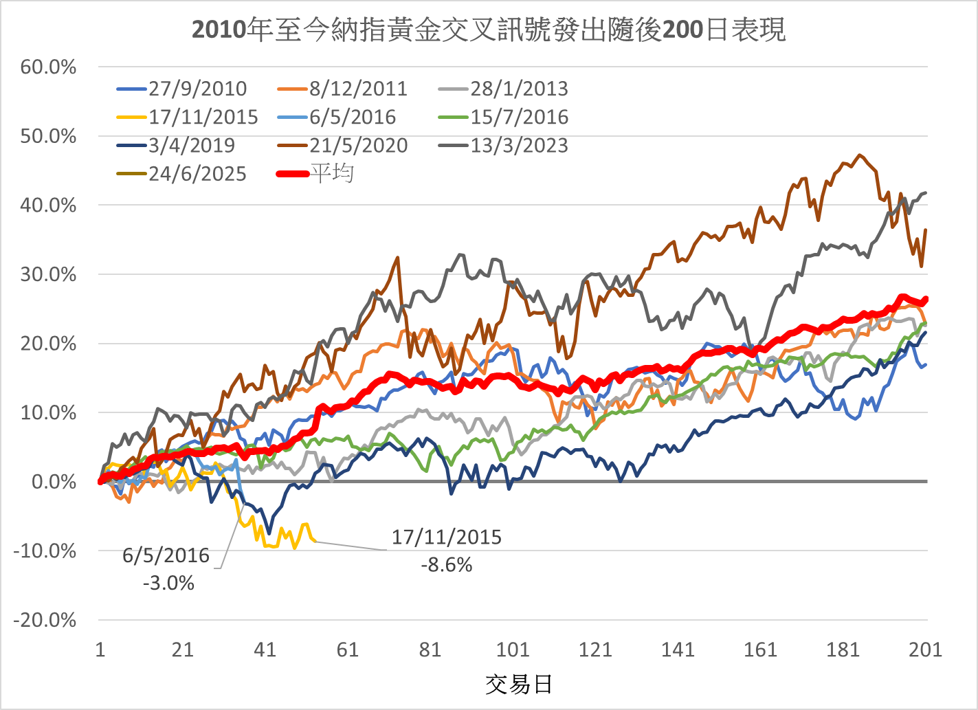 具體而言,除了2015年11月17日與2016年2月6日這兩次較爲短暫的“假金叉”(訊號僅維持53及36個交易日),其餘7次“金叉”均延續至少224個交易日以上(見圖1),顯示訊號具有相對持久的趨勢參考價值。若然進一步分析這9次歷史訊號(不包括本次)在出現後200個交易日內的納指表現(或於其間出現“死亡交叉”爲止,以較早者爲準),僅上述兩次假訊號分別錄得8.6%及3.0%的回調,其餘7次則全部錄得顯着升幅,升幅範圍介乎17%至41.8%。