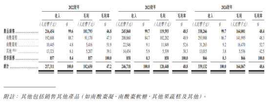 公司旗艦產品即南酸棗糕的收入由2022財年的1.93億元增長52.6%至2024財年的2.94億元;公司南酸棗粒產生的收入由2022財年的1044.5萬元顯著增加199.3%至2024財年的3126.3萬元。以上增加主要由於消費者對品牌的認可度提升令市場需求增加及經銷網絡的擴張,線下經銷商數量由2022年12月31日的140家增加至2024年12月31日的199家。
