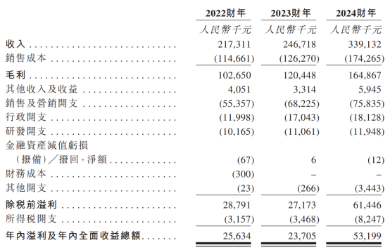 於2022財年、2023財年、2024財年,公司收入分別爲2.17億、2.47億、3.39億元人民幣(單位下同),對應同期,年內溢利及年內全面收益總額分別爲2563.4萬、2370.5萬、5319.9萬元。