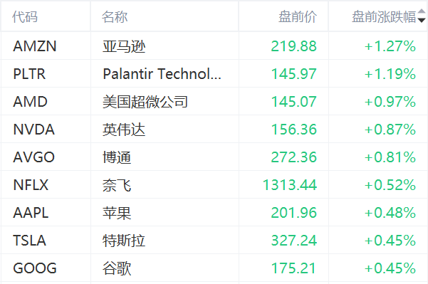 美股盤前時段,明星科技股普漲,截至發稿 亞馬遜 、 Palantir Technologies Inc. 漲超1%,芯片股走高, 英偉達 、 美國超微公司 、 博通 漲近1%: