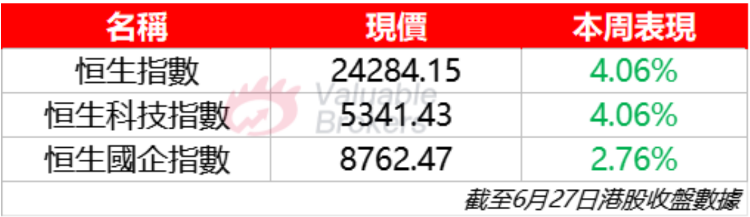 本週港股三大指數集體走高;恒生指數週漲幅3.2%,報24284.15點;恒生科技指數漲幅4.06%,報5341.43點;國企指數漲幅2.76%,報8762.47點。