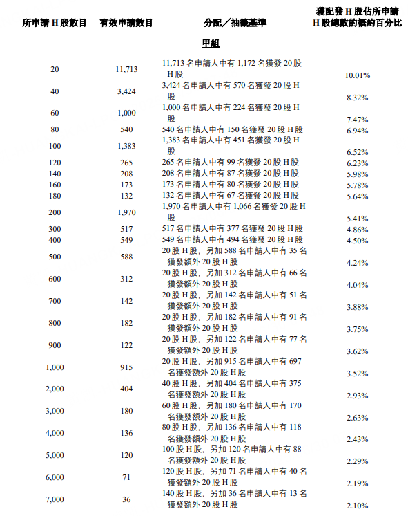 公開發售階段雲知聲91.66倍認購,經回補、重新分配後,公開發售的發售股份最終數目爲62.44萬股股份,佔發售股份總數的約40%。合共接獲約25483份有效申請,受理申請數目約8446份,申購一手獲配發股份佔所申請股份總數的概約百分比爲10.01%。