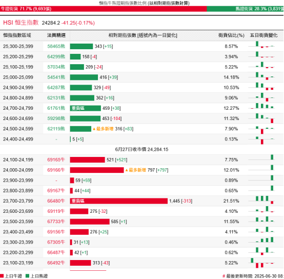 過去5日,恒指牛證合計約1722萬港元資金淨流入;恒指熊證則合計約8420萬港元資金淨流出套現。街貨分佈方面,至上週五,恒指牛證街貨佔比升至約71.7%,分佈在收回價23700點至24200點之間,累計相當約2866張期指合約;恒指熊證街貨在收回價24400點至25100點之間,累計相當約2340張期指合約。